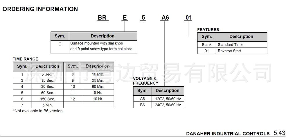 EagleSignal继电器,计时器EAGLE SIGNAL价格优惠!EAGLE-SIGNAL美国原装进口。 选型及规格如下, EagleSignal - Electronic reset timer; Surface mtg.; 240VAC; 10 min. Specifications Item Number: BRE8B6 Manufacturer: Eagle Signal - Danaher Specialty Pro Item Category: Timers Subcategory: Preset Timers Series: BRE RESET TIMER Operating Voltage: 240 VAC Mounting: Surface Mount Timing Range: 6 Seconds ~ 10 Minutes Display Type: Dial Knob Termination: Screw Indicator Light: No Approvals: UL;CUL H x W x D (in.): 4.25 x 2.63 x 3.75