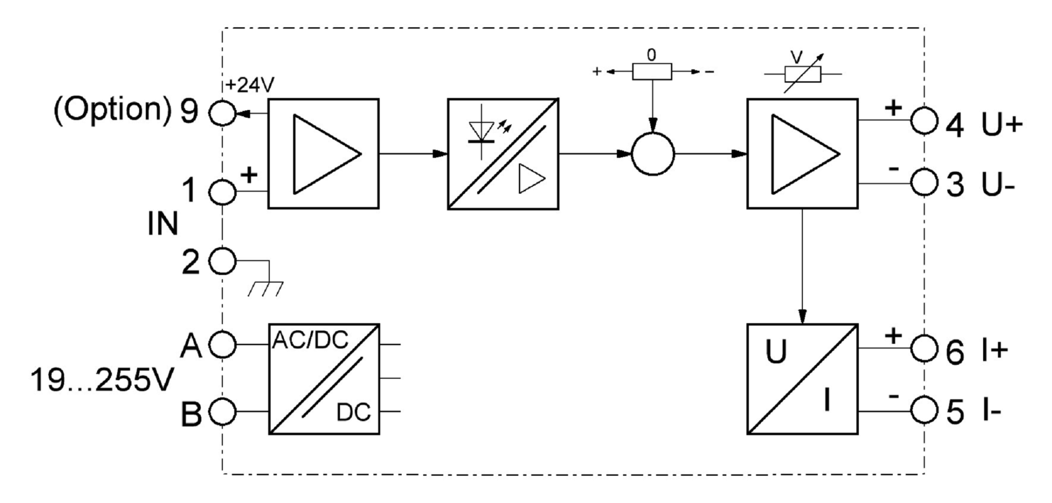 校准的切换发生在文档中规定的误差范围内。输入信号通过光电隔离实现,并在输出级再次转换为电压和电流信号。
